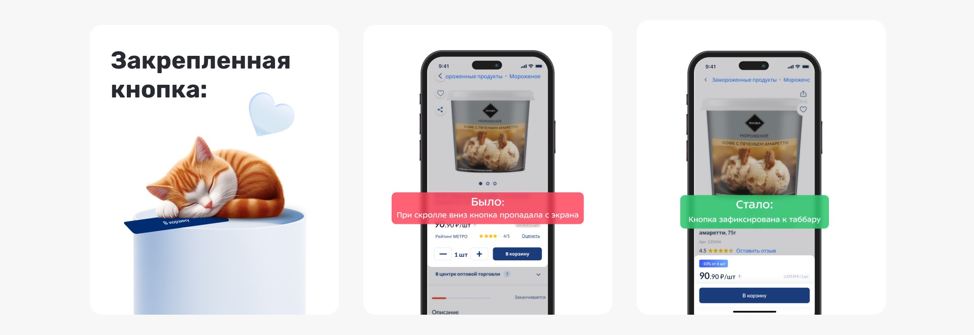 Добавить фиксированную кнопку "В корзину" внизу экрана, поверх интерфейса, прямо над таббаром. При прокрутке страницы кнопка остаётся на месте, не исчезая, обеспечивая удобный доступ к добавлению товаров в корзину.